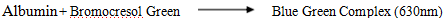 血清白蛋白在pH4.2的緩沖液中帶正電荷, 在有非離子型表面活性劑存在時, 可與帶負電荷的染料溴甲酚綠結 合形成藍綠色復合物,在波長630nm處有吸收峰,其顏色深淺與白蛋白濃度成正比例。