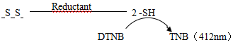 還原劑會使二硫鍵裂解,裂解后的巰基會發生親核反應, 即巰基與5,5’-二硫代-雙-硝基苯甲酸(DTNB)反應,生成黃色化合物,在412nm處有吸收峰,據此可以計算蛋白質二硫鍵含量。
