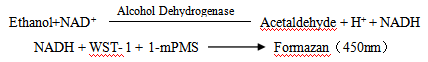分別用酸性和堿性提取液提取樣本中NAD+和NADH,在1-mPMS作用下,WST-1可與NADH反應,產生水溶性formazan,在450nm下有特征吸收峰,而NAD+可被乙醇脫氫酶還原為NADH,進一步采用WST-1檢測。