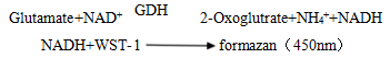 谷氨酸脫氫酶(GDH)催化谷氨酸和NAD生成α-酮戊二酸、NADH和NH??在1-mPMS作用下,WST-1可與NADH反應,產生水溶性formazan,計算谷氨酸含量。